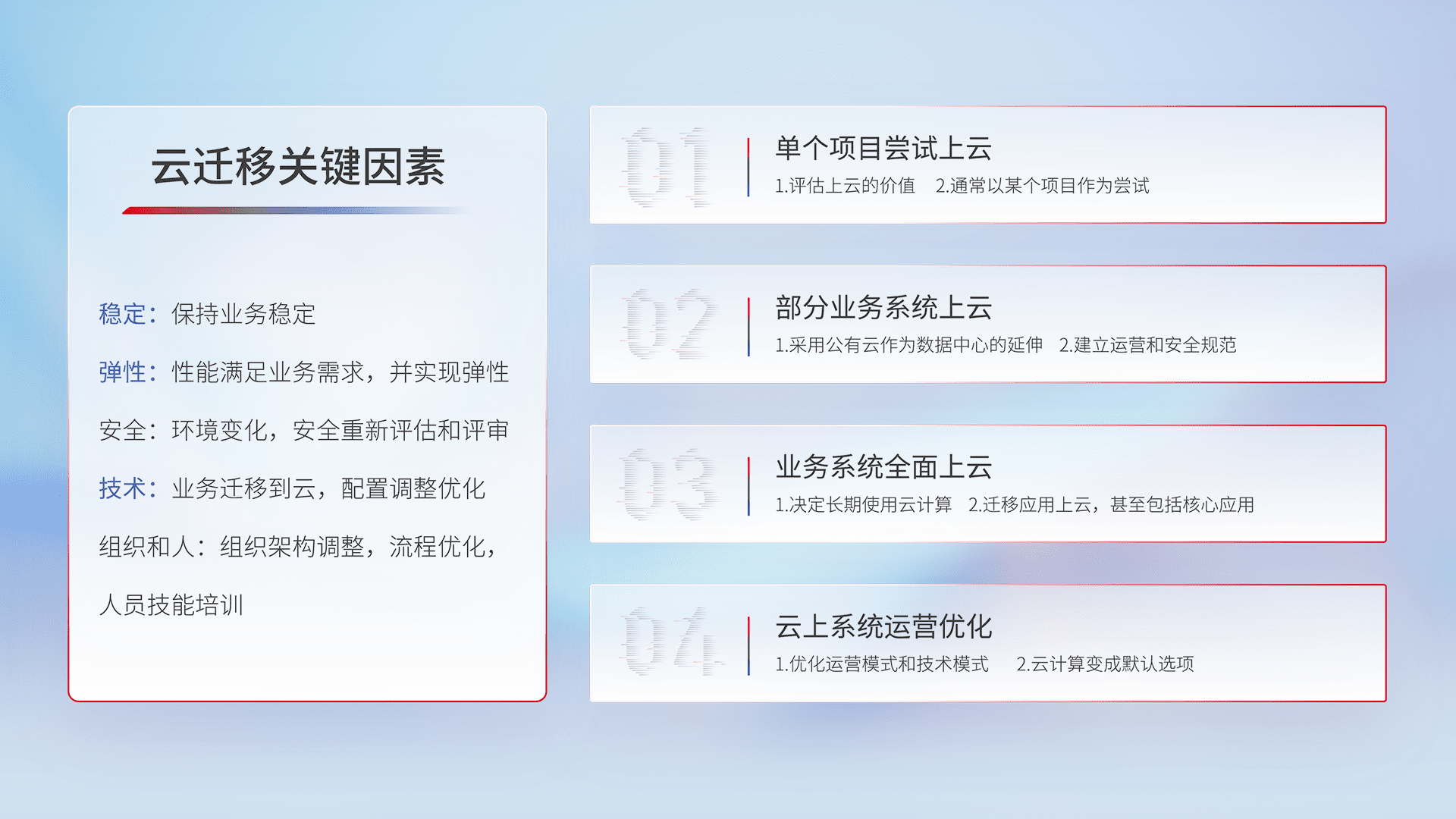 结合实际业务,,从规划设计、、、、云平台选型、、、、云原生改造、、、数据迁移、、、集成交付,,,迁移全过程为客户识别最佳上云路径,,做好风险识别管理,,,,设计网络架构、、、身份权限、、安全审计合规、、、操作审计、、、、日志审计、、、监控告警策略、、、多站点容灾设计等,,对云上基础设施进行整体规划,,,提升IT治理水平,,,以满足弹性、、高可用、、、高性能的需求。。。。