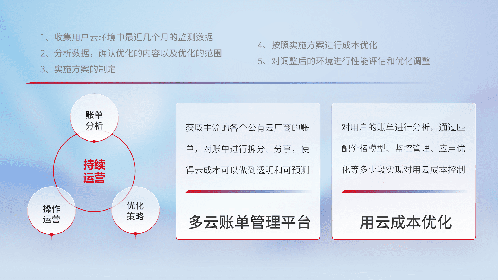 通过多云纳管,,,,以统一的资源数据模型把客户的云资源进行抽象和封装,,进而实现对多云资源的统一操作,,,保障云资源管理的可靠性、、、、稳定性与可用性。。。。量身定制化运维内容,,配置、、、、开发运维、、补丁管理、、、备份、、、、监控、、认证和访问管理、、审计和日常巡检等,,保障在用云过程中的可靠度,,,,稳定度以及高可用率。。。。